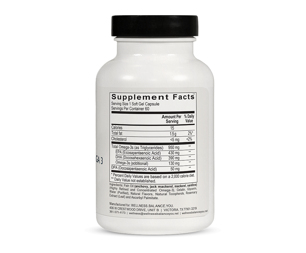 HEAD TO TOE FISH OMEGA 3 provides 820 mg of eicosapentaenoic acid (EPA) and docosahexaenoic acid (DHA) as well as 50 mg of docosapentaenoic acid (DPA) per soft gel as re-esterified triglycerides, the preferred form with superior absorption. Vitamin E (as mixed tocopherols) and rosemary extract are used to ensure maximum purity and freshness.